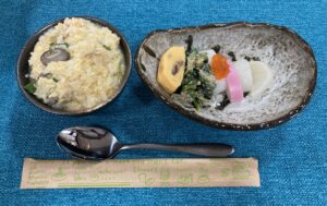 今月はおかゆ、胡麻和え、鰻巻き、紅白かまぼこ、お漬物です。