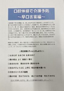 また口腔体操では早口言葉を皆で唱和して、楽しみながら介護予防を学びました。